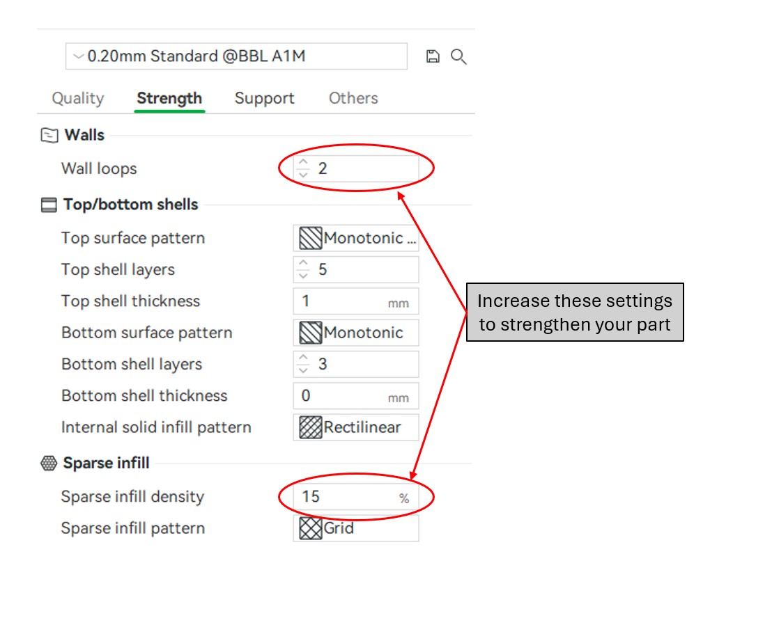 Knowing how to print a strong part is useful, as it allows you to use 3D-printed parts in fully functional prototypes. You can do things at all points during the 3D printing process to increase the strength of a part. Additionally, other materials that can be 3D printed are much stronger, some of which the Design Innovation Lab at Wendt can print. A very brief list of strong filaments include Polycarbonate (PC), Nylon Filaments, and Carbon Fiber reinforced filaments. Check out Bambu Labs Filament Guide for more information on possible materials.