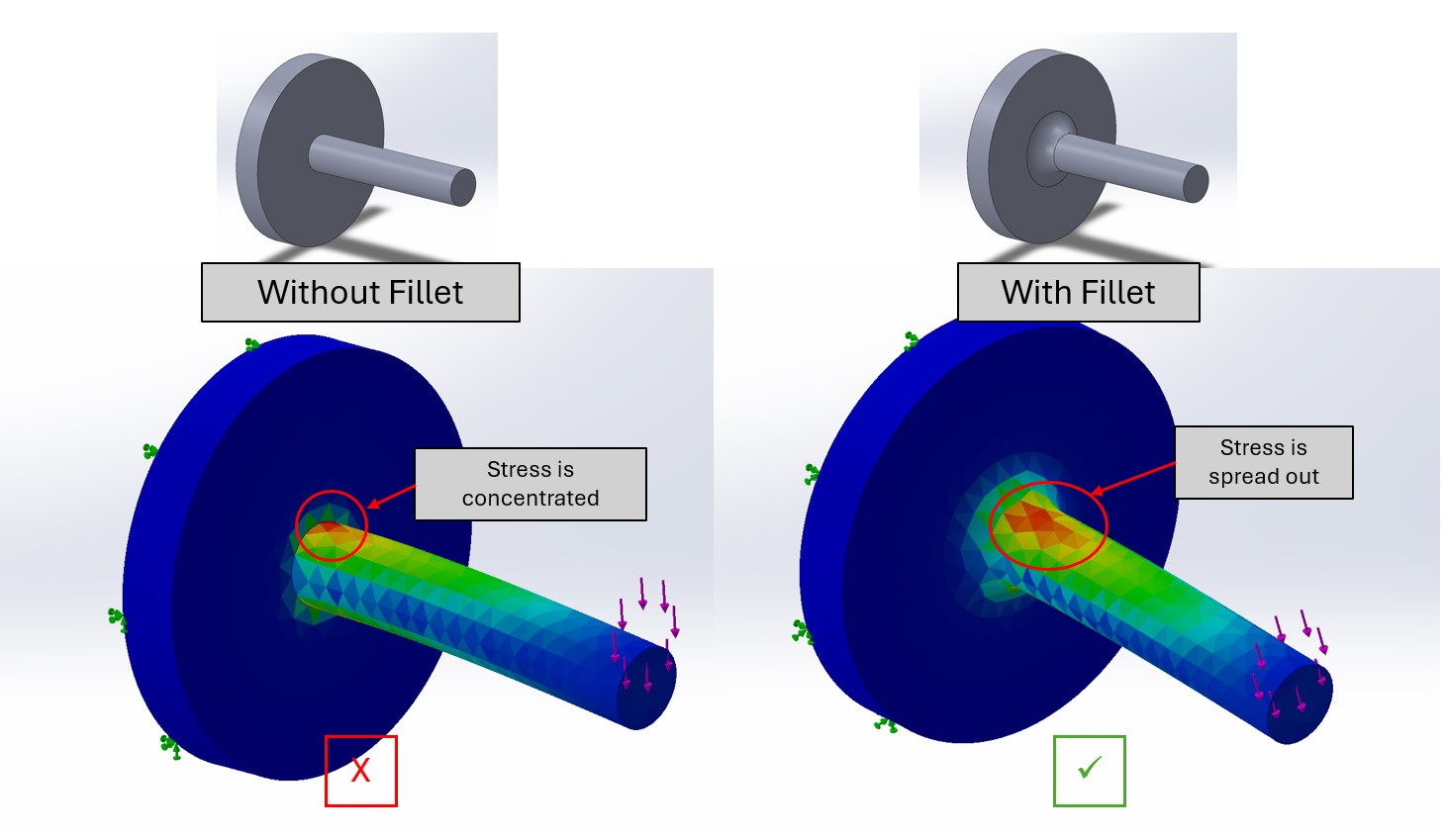 Figure 2. Using a fillet to avoid a stress concentration, resulting in a much stronger part.