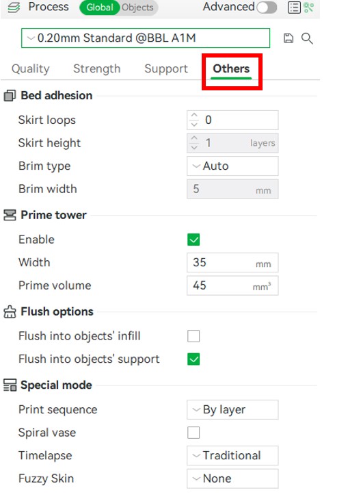 The other tab includes bed adhesion settings, prime tower settings, and some other settings that may be helpful. The most useful setting available in the other tab is the bed adhesion settings. This is helpful as sometimes (especially parts with small bed contact area) parts will peel off the bed resulting in failed prints or unwanted artifacts.