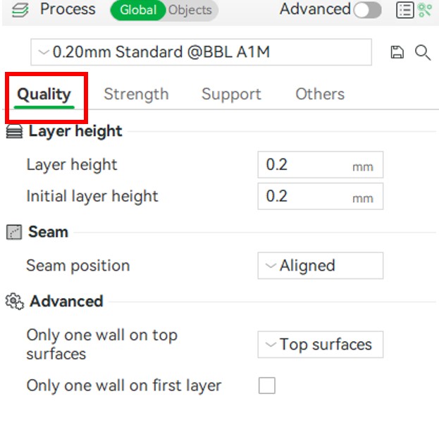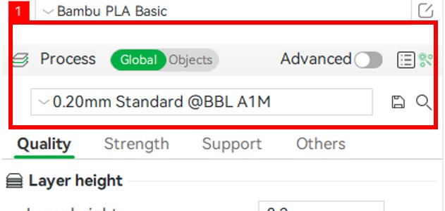Bambu Studio has various profiles that allow a user to quickly change a preset and print. These for the most part are a combination of different layer heights and printing speeds. The layer height values vary from 0.08 mm to 0.28 mm or extra fine to draft quality. This can be helpful for creating very high detailed parts, or making a part very fast. (Draft quality can be up to 3.5 times faster than extra fine quality). Figures 1 and 2 shows this menu with all the available presents and the affects on printing. (Note: Have to have model selected and be under the global tab.)