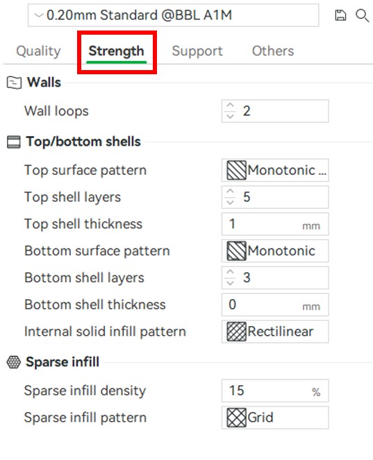 The strength tab is how the part strength is determined. Here the number of walls, top and bottom shells and infill pattern and density can be modified to make a part as strong as it needs to be. As with everything in 3D printing, there is a balance between part strength and material usage and print time. The stronger the print, the more material there is and the longer print time an object has.