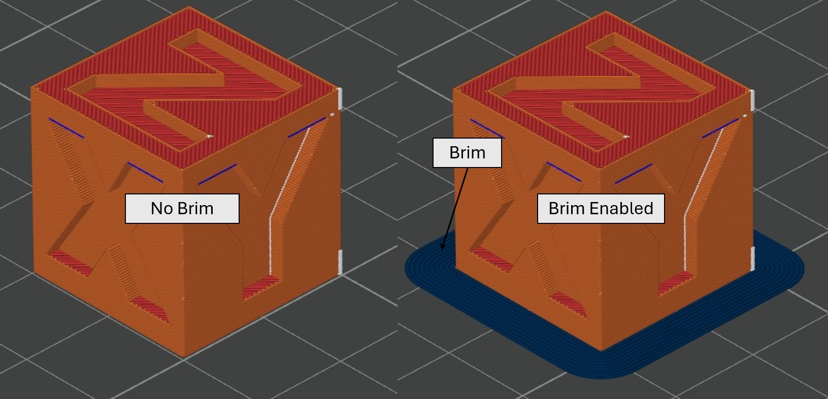 Figure 1. (Left) No brim enabled and (Right) a 5mm brim enabled.