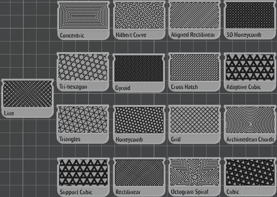 Figure 3. Infill Patterns in Bambu Studio at 35% infill. (Lightning Infill pattern not included)