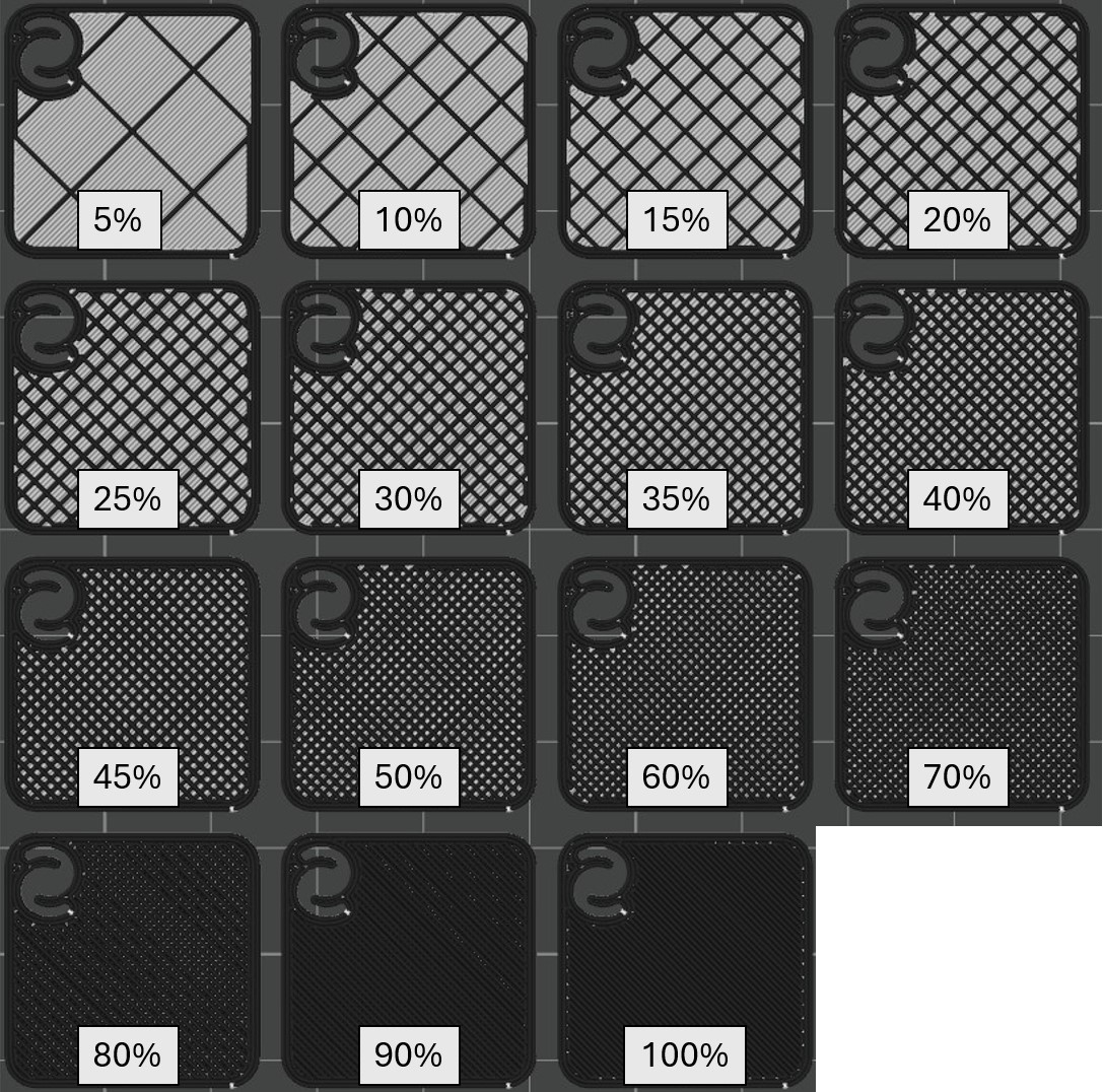 Figure 2. Infill percentages for the grid infill from 5% to 100%(solid). Model Credit: EmE Creative Lab