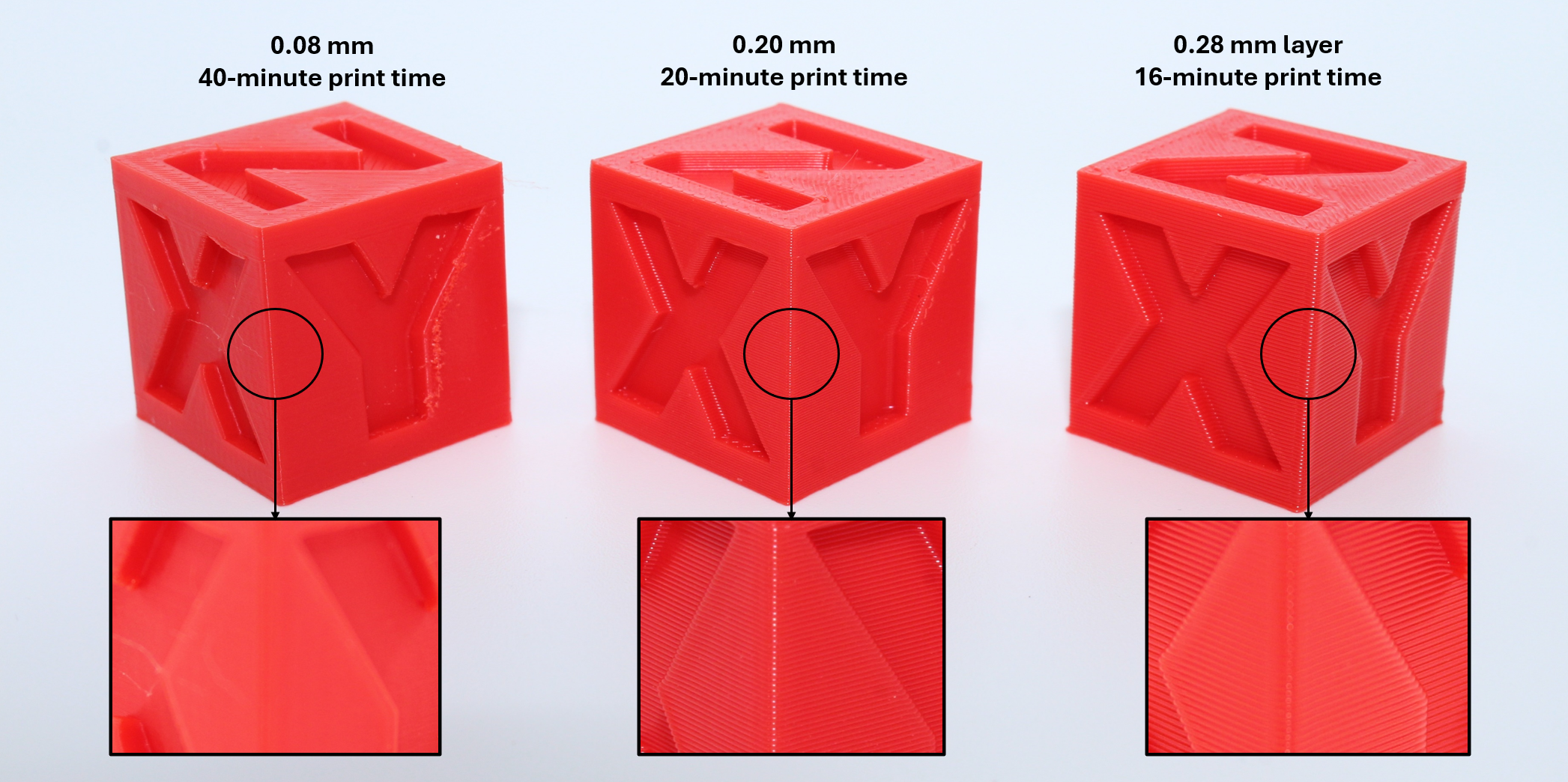 Figure 1. The print times and visible layer heights of the same calibration cube.