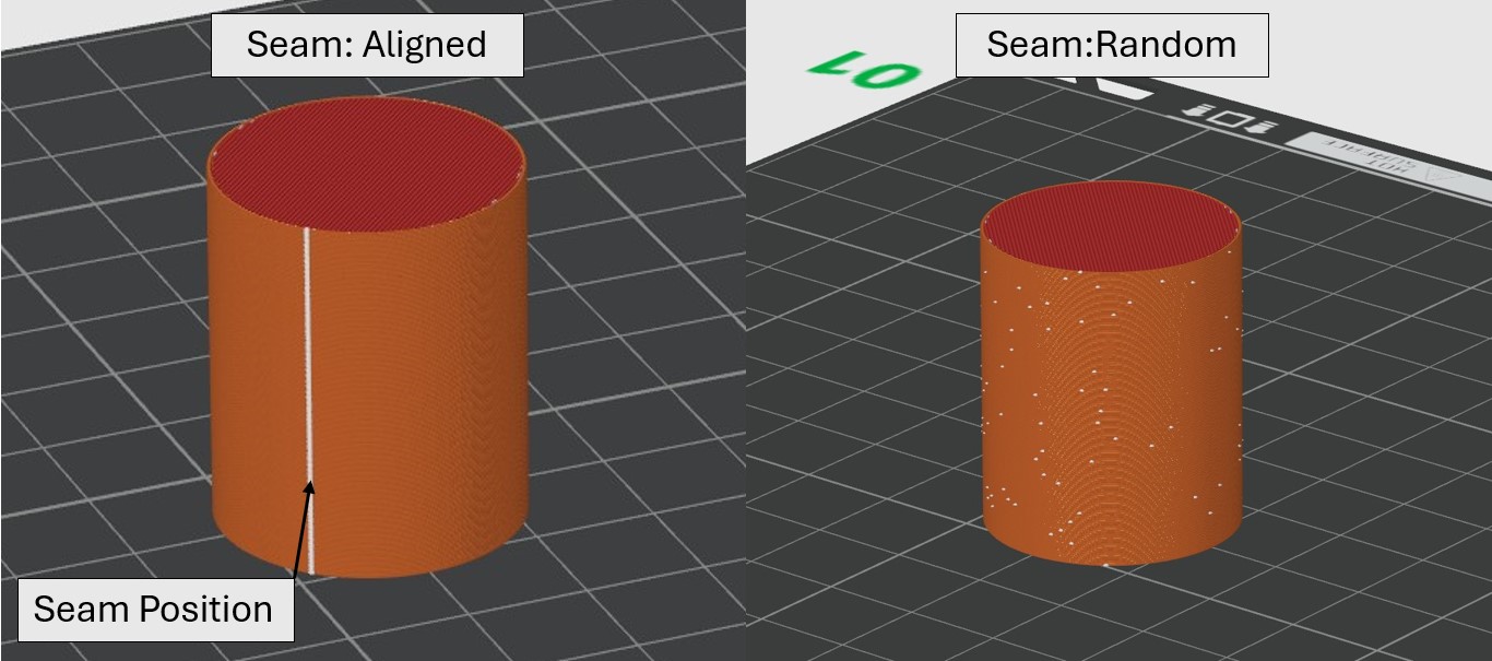 Seam Position refers to the location of where the seam is in the print. The seam is where a new layer starts on a print which can lead to a small bump on the print. The seam is especially noticeable on cylindrical parts.