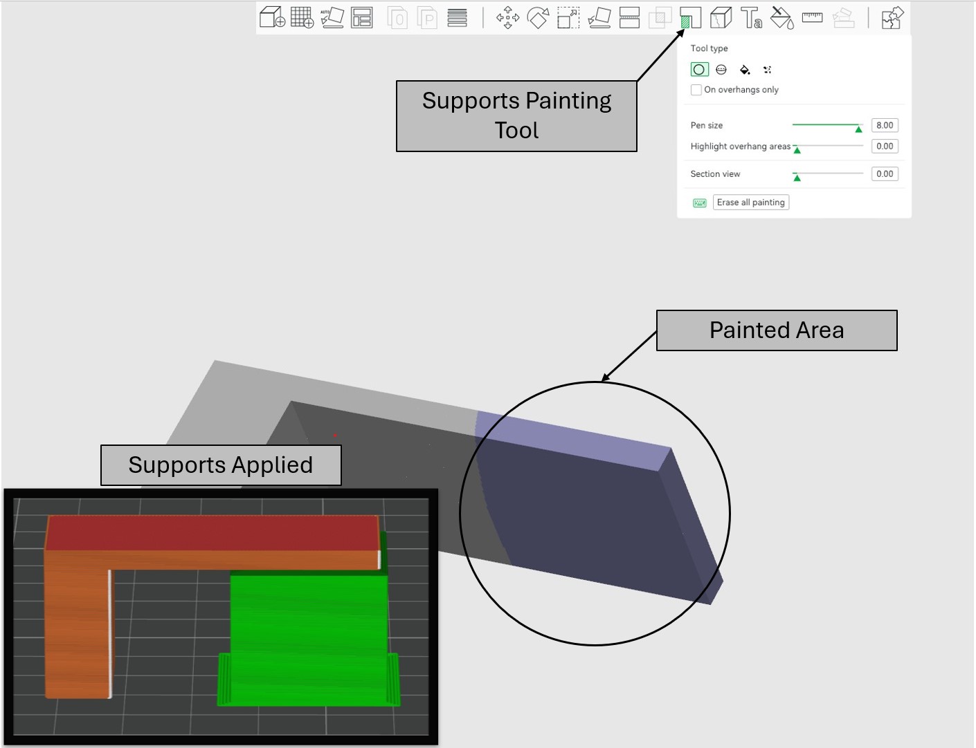 Bambu Studio allows you to paint supports on your model where supports will only be applied to the painted area offering manual control over support location. This can be incredibly helpful if your model has overhangs that need support, as well as internal cavities that do not require support or where removing supports would be difficult or impossible. Figure 3 shows how support painting works in Bambu Studio.