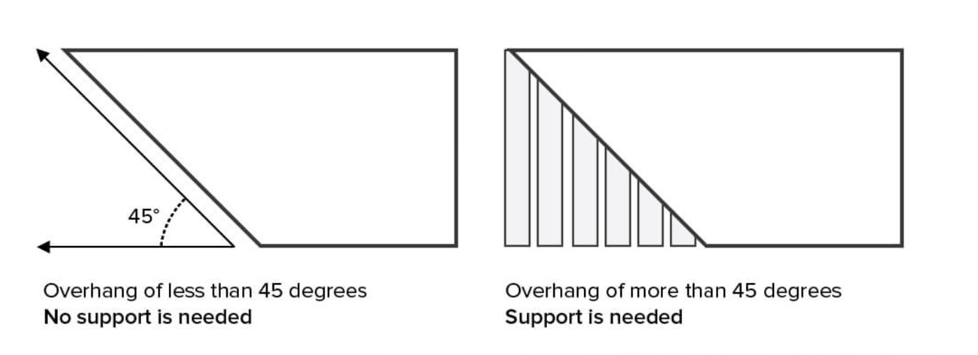 Figure 1. The 45 degree overhang rule for determining if supports are necessary or not. (Image Source: 3D Hubs)