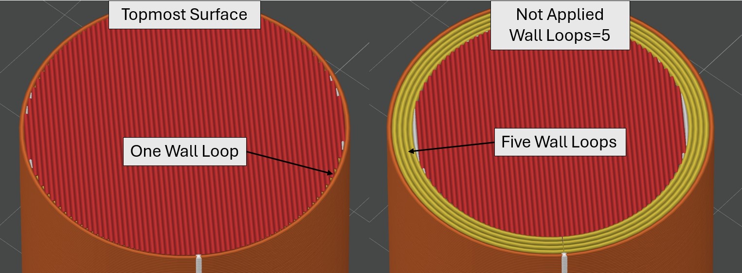 Figure 4. Top Surface setting versus Not Applied Setting with five wall loops