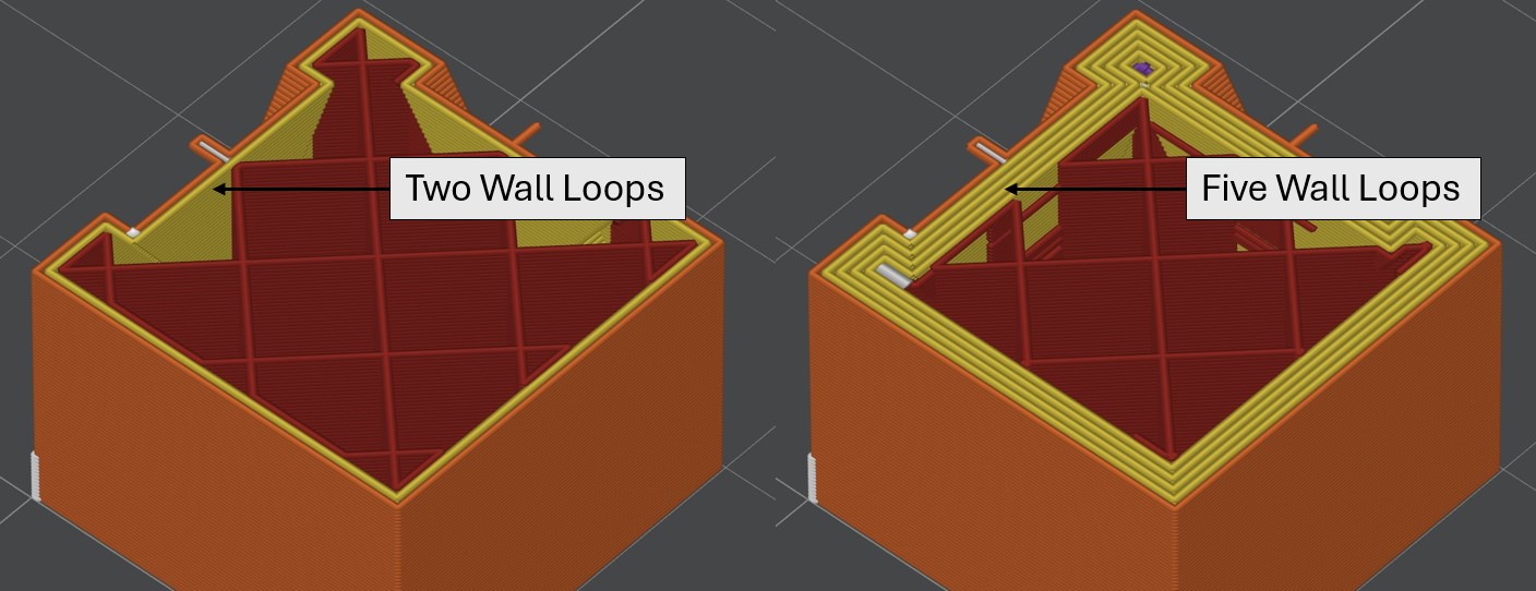 The walls setting is the number of solid layers on the outside of a part before the infill pattern starts. A typical value here is between 3-5 walls. A value much higher than this can be unnecessary and a value less than this would yield a weak part. Figure 1 shows a cross section of a calibration cube with the wall loops setting set to two and five.