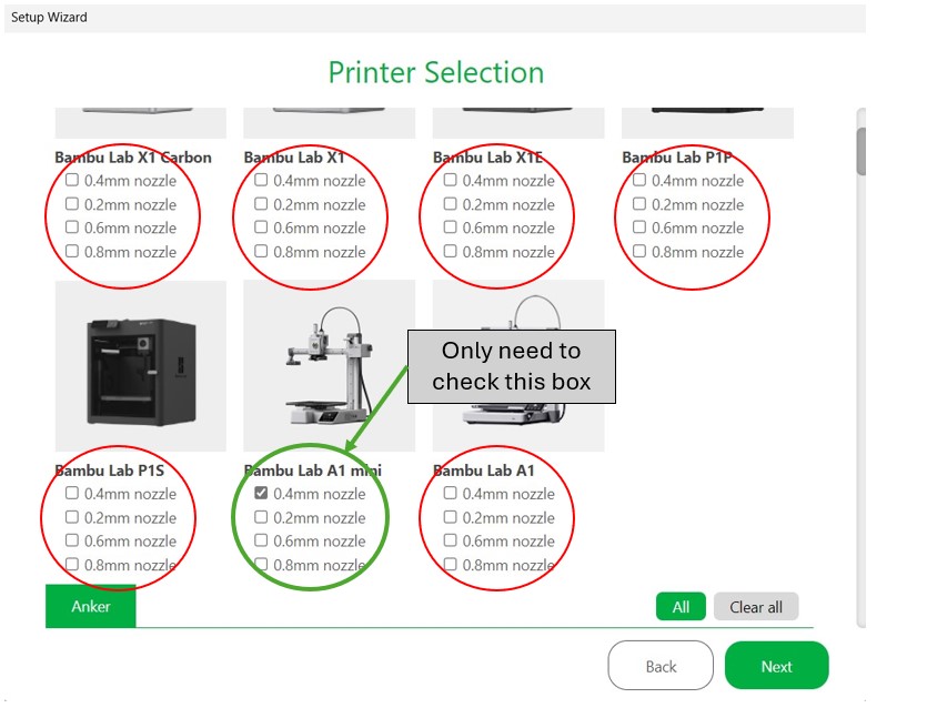 5. Uncheck all printers, besides the A1 mini