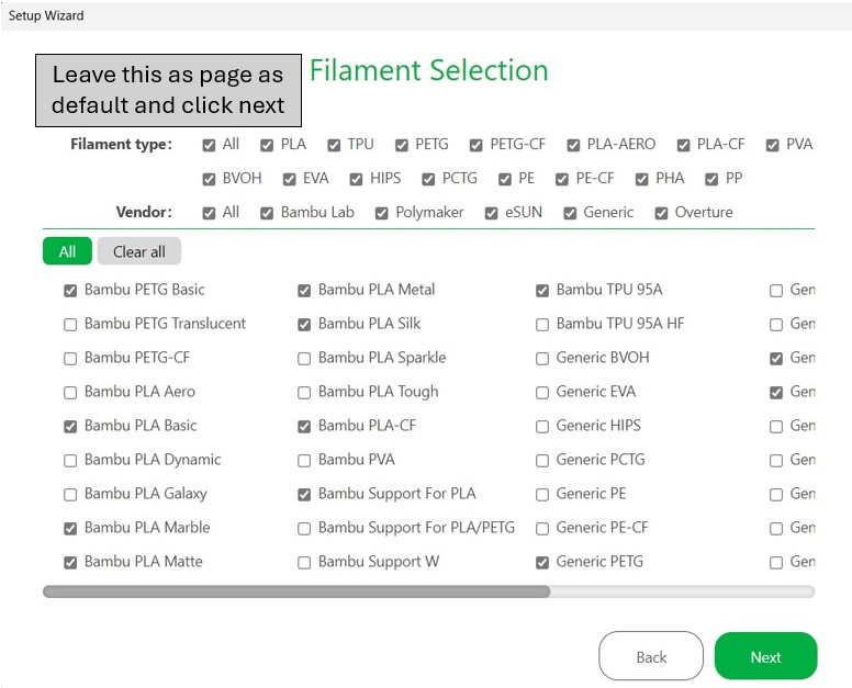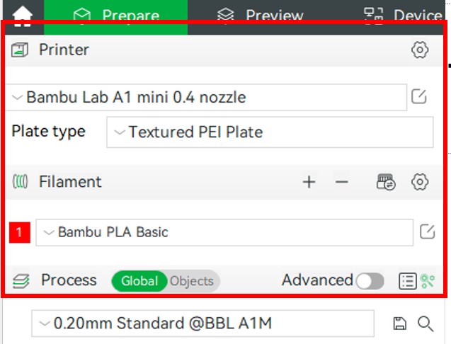 The printer and material settings allow you to quickly change between different printers, base plates, and material types. For our use case, always make sure that the the printer is set to the A1 mini. (If you go through and slice with a different printer setting, the part will not load on the printer.)